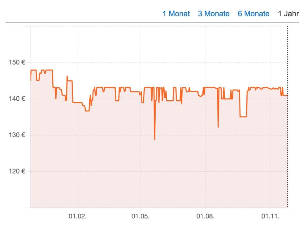 Spadek ceny Apple TV obserwowany jest od około roku. Jednak ceny są przez większość czasu dość stabilne, z kilkoma wartościami odstającymi. Zazwyczaj jednak pudełko kosztuje co najmniej 140 euro w górę, jak widać na grafice przedstawiającej historię cen Idealo w ciągu ostatnich 12 miesięcy.