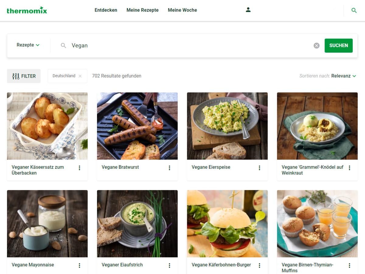 Za duży wybór? Nie ma problemu, ponieważ dodatkowe filtry można wykorzystać np. do wyszukania konkretnego składnika. Jeśli więc masz ochotę na coś na przykład z grzybami, możesz określić "grzyb" jako obowiązkowy składnik. Możliwe są również inne składniki, ale oczywiście dalej ogranicz wybór. Nawiasem mówiąc, wegetarianie i weganie również mogą dobrze radzić sobie z Cookidoo. W czasie testu (lipiec 2019) na Cookidoo dostępnych było ponad 700 wegańskich i prawie 4000 wegetariańskich przepisów w języku niemieckim.