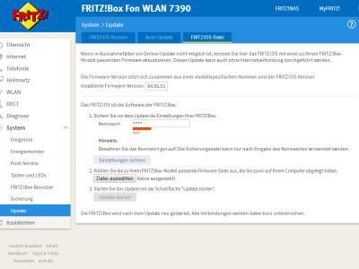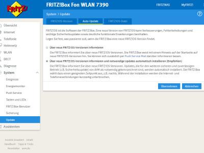 Oprogramowanie układowe jest aktualizowane za pomocą pozycji menu „System” »„ Aktualizacja ”. Kliknij tam na „Znajdź nowy FRITZ! OS” Następnie sprawdzane jest, czy dostępna jest aktualizacja i, jeśli to konieczne, instalowane jest nowe oprogramowanie sprzętowe. Jeśli najnowsze oprogramowanie jest już zainstalowane, zostaniesz o tym poinformowany.
