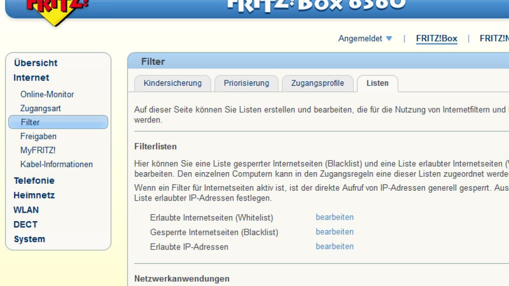 Najpierw przejdź do punktu „Internet / Filtry / Listy” i wywołaj jedną z list filtrów, na przykład czarną listę zablokowanych witryn. (Zdjęcie: Screenshot Fritz! Box) (Źródło: Screenshot Fritz! Box) [Pokaż na jednej stronie | Pokaż jako historię] Zdjęcie 1/9