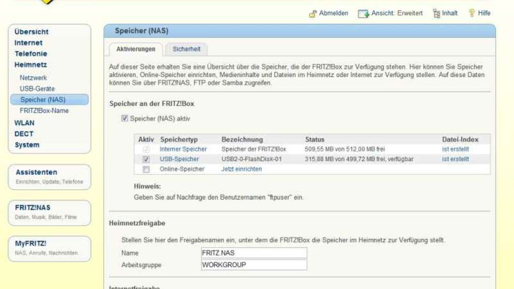 Następnie aktywuj podłączone urządzenie pamięci masowej USB w sekcji „Sieć domowa” i aktywuj „Pamięć (NAS)”. (Zdjęcie: Zrzut ekranu) (Źródło: Zrzut ekranu) [Pokaż na jednej stronie | Pokaż jako historię] Zdjęcie 4/10