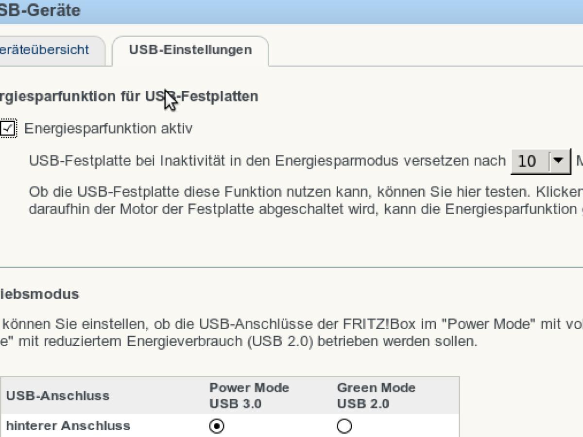 Przede wszystkim potrzebujesz pamięci z mediami, w najprostszym przypadku dysku twardego USB bezpośrednio na Fritz!Box (pamięć w chmurze dostępna później). Najlepiej jest wcześniej skopiować muzykę, filmy i zdjęcia na dysk USB, jest to łatwiejsze niż korzystanie z interfejsu Fritz!Box w przeglądarce. Możesz również dodać pliki później za pośrednictwem obszaru Fritz!NAS. Podłącz dysk i przejdź do „Sieć domowa / Urządzenia USB”, powinien pojawić się tam automatycznie, w przeciwnym razie router ma problem ze sprzętem do przechowywania danych. W „Ustawieniach USB” warto z jednej strony przejść na szybki standard USB 3.0, a z drugiej włączyć tryb oszczędzania energii, aby wyłączyć dysk twardy, gdy nie jest używany.