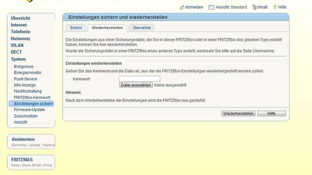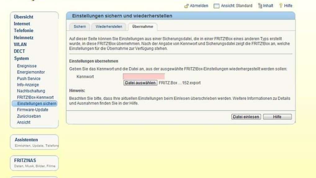 Strona transferu jest przeznaczona do importowania plików kopii zapasowych z innych routerów AVM. Aby to zrobić, musisz podczas tworzenia kopii zapasowej przypisać hasło. (Zdjęcie: Zrzut ekranu) (Źródło: Zrzut ekranu) [Pokaż na jednej stronie | Pokaż jako historię] Zdjęcie 4/5