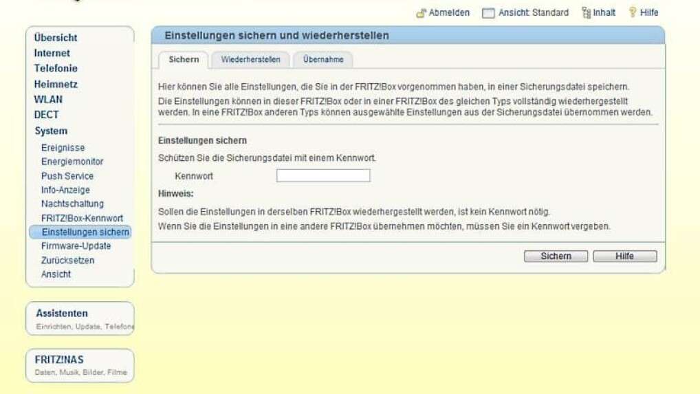 Kopia zapasowa jest wykonywana jak zwykle za pośrednictwem interfejsu ustawień w „fritz.box”. Po wprowadzeniu hasła użytkownik zostaje przeniesiony do przeglądu. Pod „System” w lewej kolumnie nawigacji znajduje się wpis „Zapisz ustawienia”.