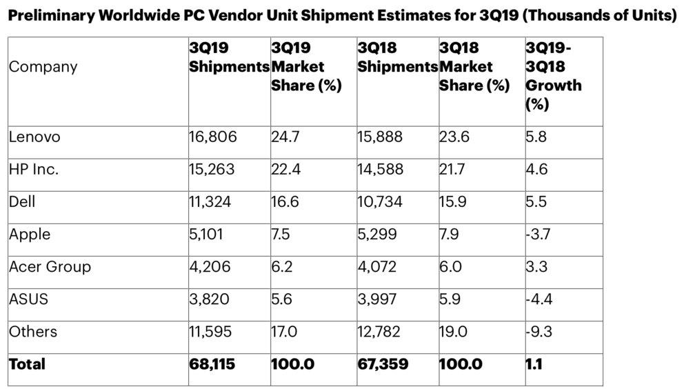 W trzecim kwartale 2019 r. na całym świecie sprzedano 68 milionów komputerów Mac i komputerów z systemem Windows, w porównaniu do 67 milionów w roku poprzednim. Gartner wymienia trwające aktualizacje do systemu Windows 10 jako główny powód wzrostu.