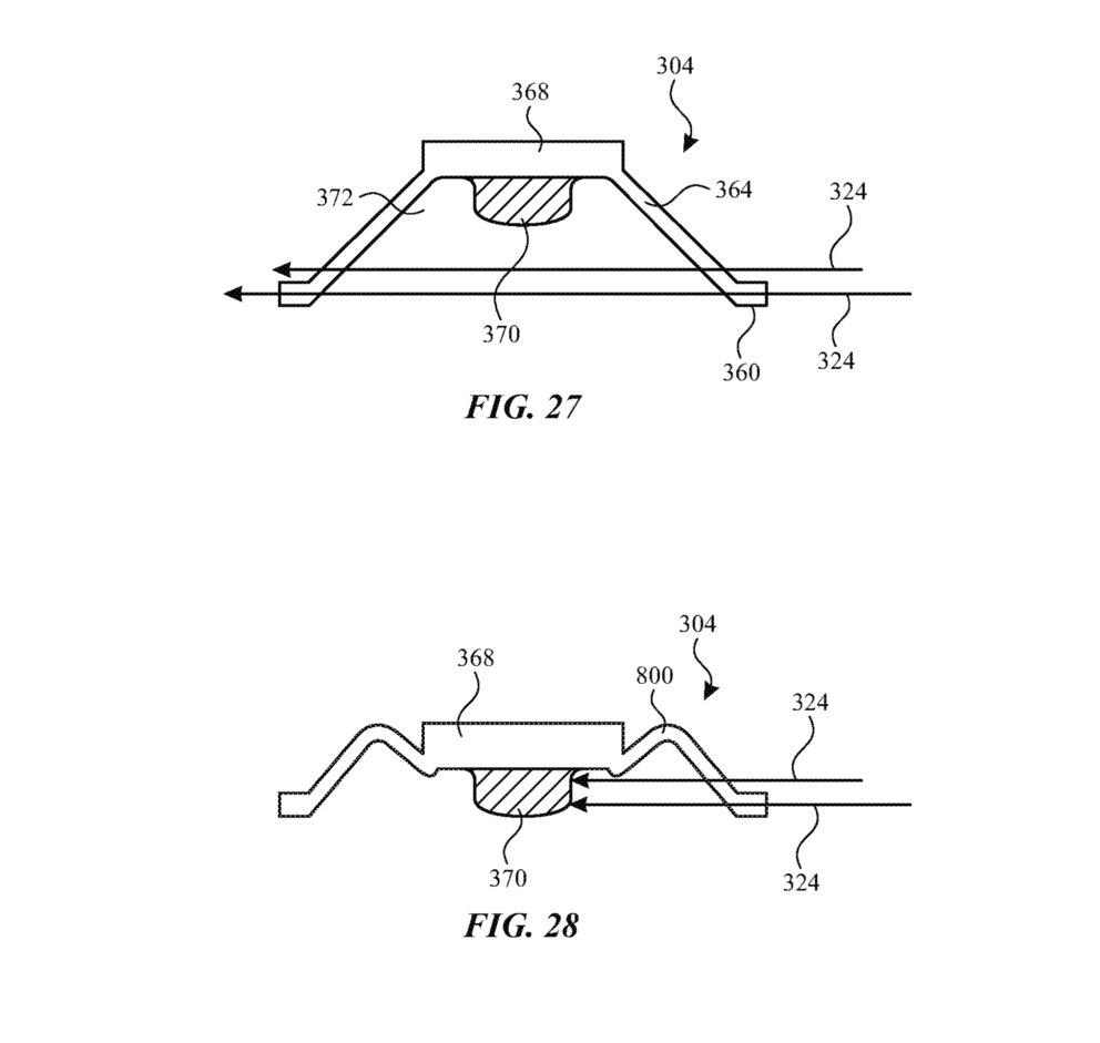 Apple opisuje w patencie różne kształty klawiszy. Niezbędne światło można było przesyłać nie tylko pod przyciskami, ale alternatywnie również przez mały otwór w mechanizmie. Tutaj również wiązka zostaje przerwana po naciśnięciu, co z kolei może być wykorzystane do wykrywania.