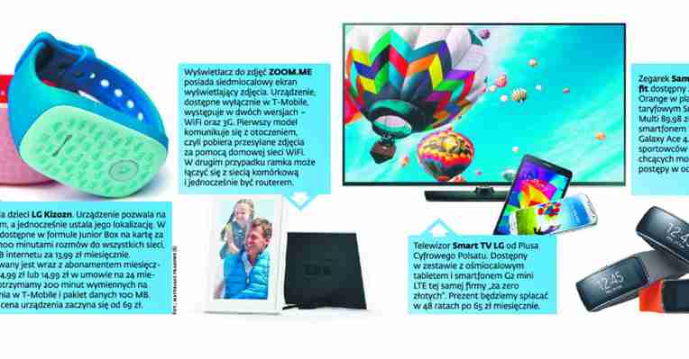 – Operator stara się oferować te urządzenia, których chcą klienci. A dziś największym zainteresowaniem cieszą się właśnie takie gadżety – wyjaśnia Wojciech Jabczyński, rzecznik Orange. Dodaje, że taka strategia, a więc dorzucenie do smartfornów innych miłych ludziom zabawek, sprawdziła się w przeszłości, więc operator postanowił rozszerzyć listę dostępnych w promocji urządzeń. W sieci Orange można dostać dwa rodzaje inteligentnych zegarków i opasek. Ceny zależą od wybranego abonamentu. Na przykład przy miesięcznym zobowiązaniu w wysokości 149,98 zł oprócz telefonu LG G3 za 1 zł otrzymamy opaskę SmartBand Sony lub smartwatch Mykronoz Zefit.