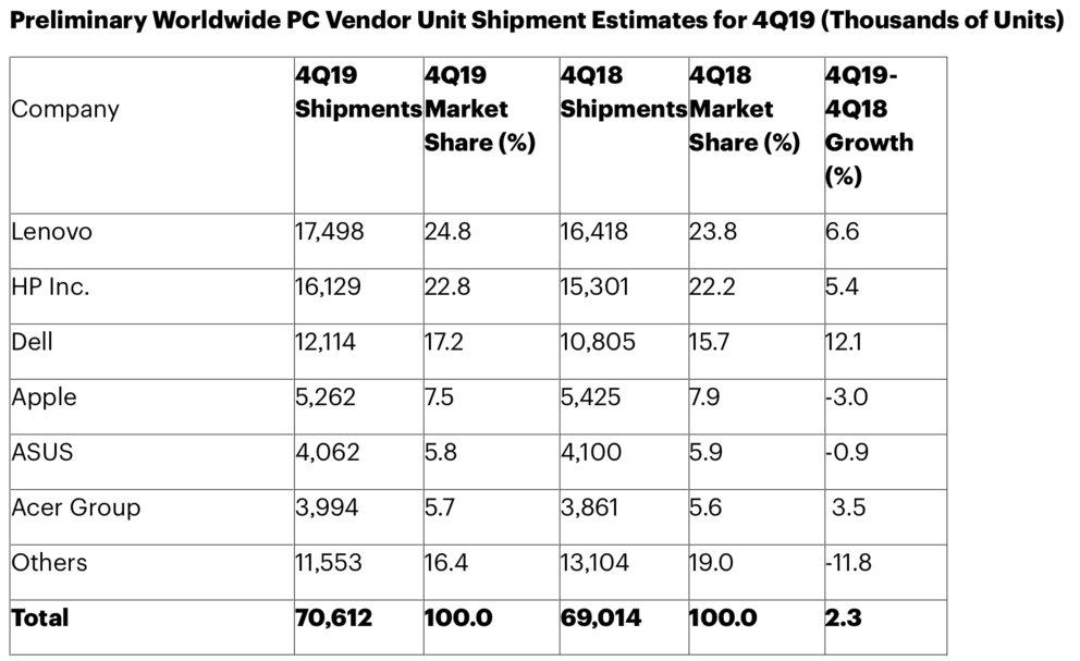 Według firmy Gartner globalny rynek komputerów PC, obejmujący komputery stacjonarne, notebooki i ultramobilne urządzenia towarzyszące, takie jak Surface firmy Microsoft, wzrósł o 2,3 procent w czwartym kwartale 2019 r. w porównaniu z tym samym kwartałem roku poprzedniego. W całym roku wzrost wyniósł 0,6 proc. Należy zauważyć, że iPady lub Chromebooki nie są częścią tych liczb.