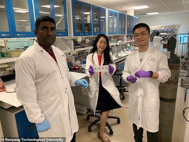 [Pot] jest prawie gwarantowanym źródłem energii wytwarzanej przez nasz organizm. Oczekujemy, że baterie będą zasilać wszelkiego rodzaju urządzenia do noszenia” – powiedział Pooi See Lee z Uniwersytetu Technologicznego Nanyang, autor artykułów i materiałoznawca. Zdjęcie od lewej: badacze Grunatan Tangabel, Poohy Sea Lee, Jian Lv